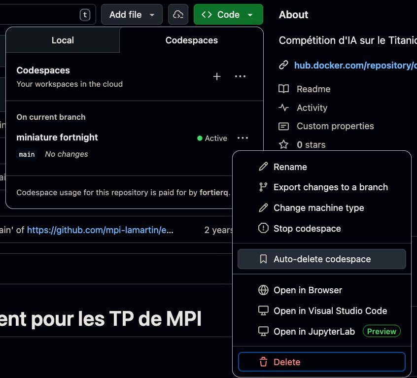 - Si vous n'avez pas encore de codespace : aller sur https://github.com/mpi-lamartin/environnement et cliquer sur le bouton Code puis "Create codespace on main".